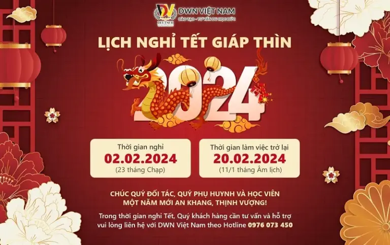 DWN Việt Nam thông báo lịch nghỉ Tết năm Giáp Thìn 2024 như sau: Thời gian nghỉ: Từ ngày 02/02/2024 (tức ngày 23 tháng Chạp)